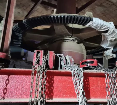由于現場工作環境空間狹小,無法使用大型起重設備,工人選擇使用多臺手拉葫蘆進行吊裝作業。手拉葫蘆是手動起重工具,適用于小型設備和工件的垂直提升、下降或水平拖拉,特別適合于空間狹窄或者沒有電源的工作環境。而且手拉葫蘆可以精細地調整吊裝位置,確保大傘齒部件精準安裝到位。在工作過程中工人利用手拉葫蘆進行設備起吊,加快設備檢修速度。